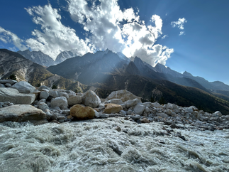 Day 2: On each day of every hike, IndiaHikes generally follows a schedule of waking up at 6 AM, having breakfast at 7 AM, and starting the hike at 8 AM. Since I don't eat breakfast, I packed it to have at lunchtime. Within ten minutes of leaving the base camp, we pass by the Gangotri temple and then proceed along the river, with views of various mountains. Unlike other regions of Uttarakhand, the mountains here are taller and drier, making the snow-capped peaks particularly memorable, as you will see further down the page.